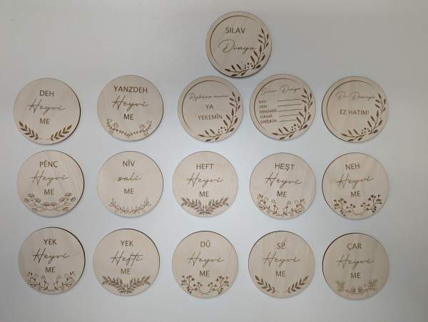 Meilensteinkarten in kurdischer Sprache aus Holz mit Gravur.