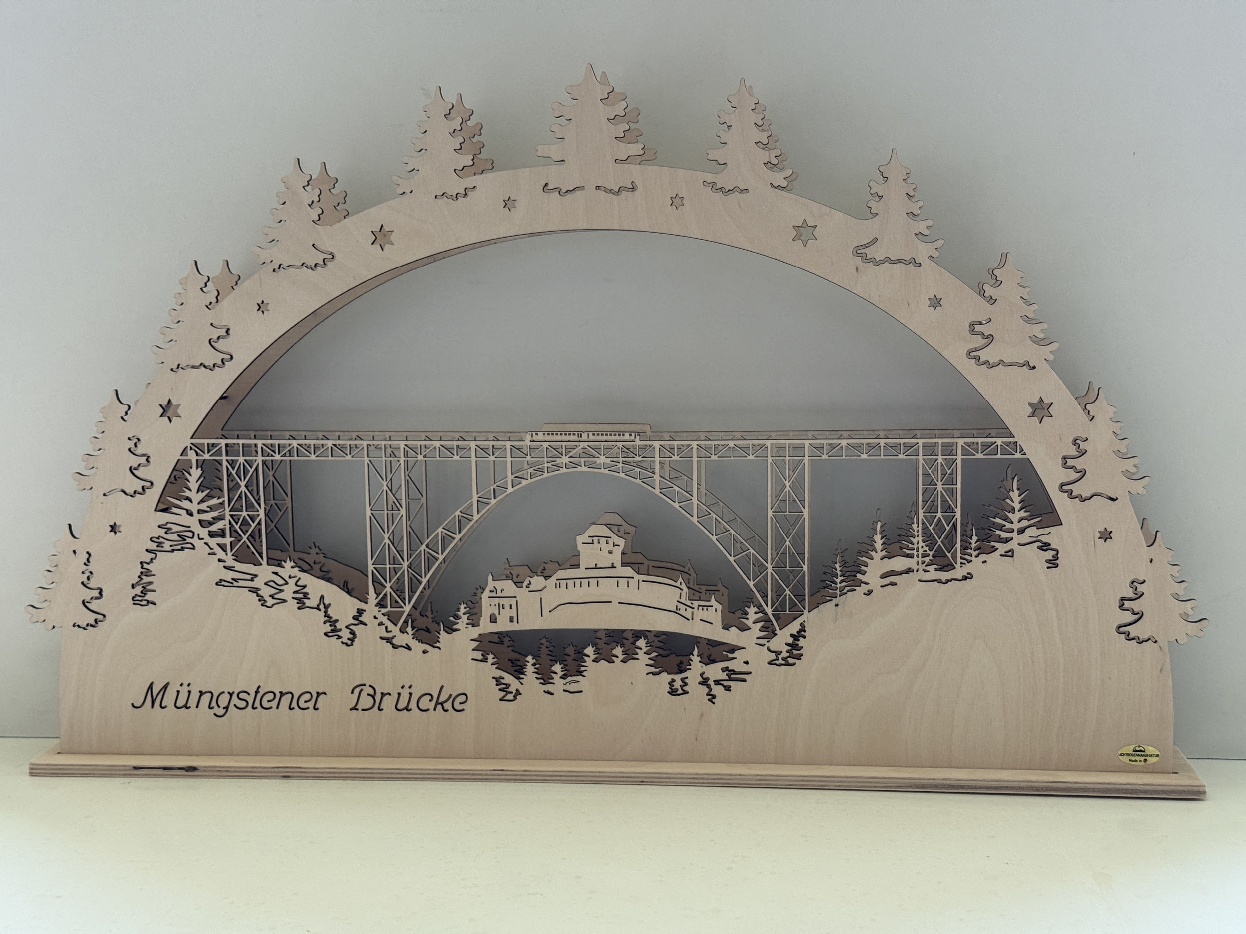 In diesem wunderschönem Lichtbogen ist die Müngstener Brücke dargestellt, die Remscheid mit Solingen verbindet. Bis 1918 trug die Brücke den Namen Kaiser-Wilhelm-Brücke.